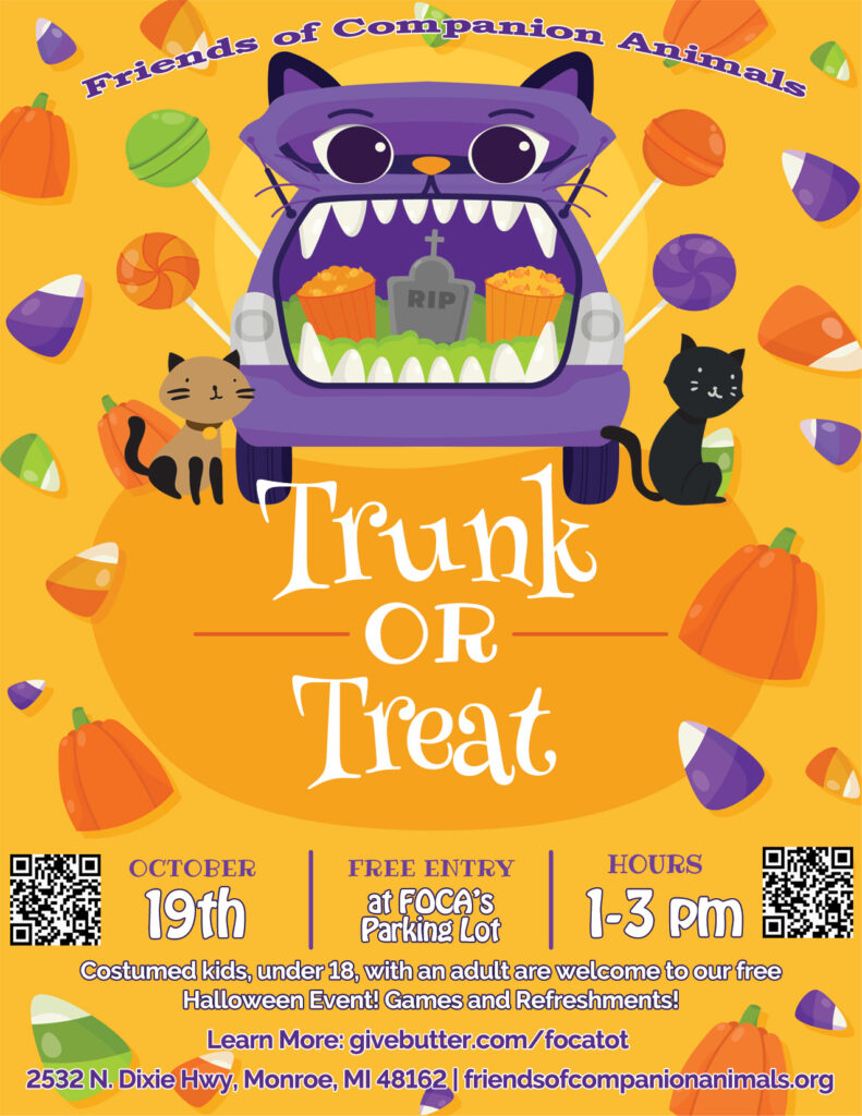 Come to FOCA’s Trunk or Treat 1-3 PM Sunday Oct. 19, 2025. Costumed minors accompanied by an adult get free candy, snacks and drinks. In addition to treat stations there will also be free carnival games and dollar raffles. Plus, for those who bring their own pumpkins or buy one at FOCA, there will be a pumpkin decorating supplies on hand. Learn more or make a donation to the cause: givebutter.com/focatot