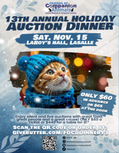 The doors open at 6 pm with dinner served at 7 PM. There will be a silent auction and also a live auction during the course of the night. There will be games of chance too like mystery boxes and the deck of cards game with items worth 100’s of dollars, not to mention a 50/50 raffle that benefits the shelter. Everything participants spend that night (with the exception of the cash bar) go to benefit the felines in our care! If you own a business or if you’ve got a generous employer, you can become a sponsor of this yearly event. Donations can include items we use in our silent auction gift baskets or ad space in our evenings’ program. A business card sized ad is only $100.